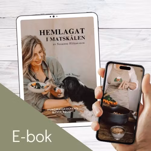 HEMLAGAT I MATSKÅLEN är boken för dig som vill ge din hund något bättre än bara det vanliga, kommersiella fodret – men är osäker på hur du ska börja. Kanske har du länge drömt om att laga egen hundmat men tvekat för att det känns krångligt eller svårt att få till en näringsbalans? Jag förstår dig! Men jag lovar att det är både enklare och roligare än du tror att laga hemlagad hundmat.