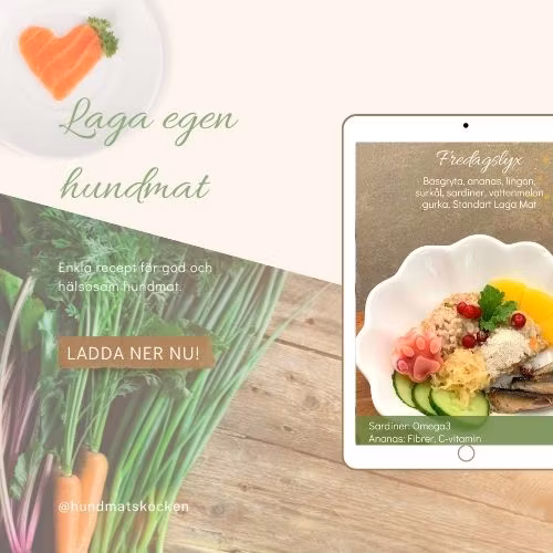 54 sidor med tips & råd om hur du på ett enkelt sätt fixar hundens favoritmat. Flera lättlagade recept med enkla basvaror, många har du redan hemma! Recept på hundkex och nyttigt godis samt enkelt recept på glass och berikningspuckar. En mängd tips på hur du kompletterar maten genom att servera olika innehåll för att förhöja näringsvärdet, samt ge hunden variation i smak, doft och struktur.